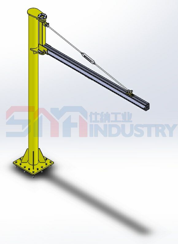 懸臂吊起重機工作強度為輕型,起重機由立柱,回轉臂回轉驅動裝置及電動葫蘆組成,立柱下端通過地腳螺栓固定在混凝土基礎上,由擺線針輪減速裝置來驅動懸臂回轉,電動葫蘆在懸臂工字鋼上作左右直線運行,并起吊重物。起重機旋臂為空心型鋼結構,自重輕,跨度大,起重量大,經(jīng)濟耐用。內置式行走機構,采用帶滾動軸承的特種工程塑料走輪,摩擦力小,行走輕快;結構尺寸小,特別有利于提高吊鉤行程。