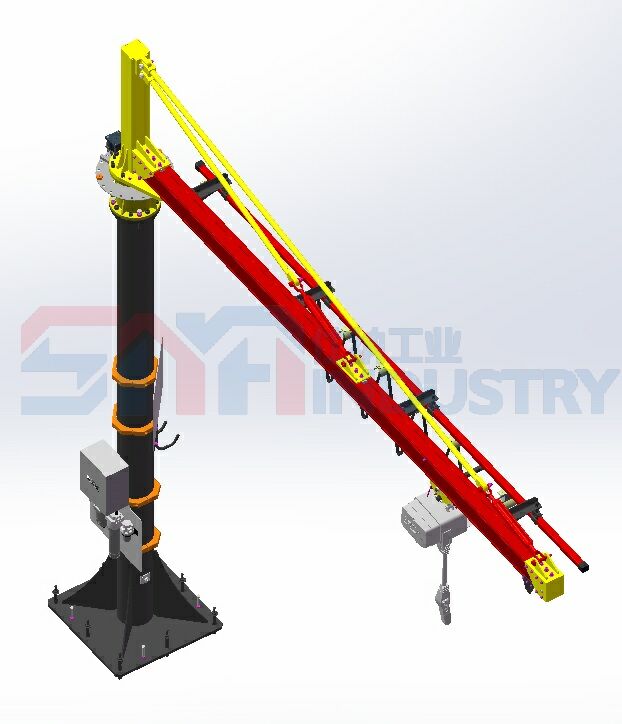 懸臂吊起重機(jī)工作強(qiáng)度為輕型,起重機(jī)由立柱,回轉(zhuǎn)臂回轉(zhuǎn)驅(qū)動(dòng)裝置及電動(dòng)葫蘆組成,立柱下端通過地腳螺栓固定在混凝土基礎(chǔ)上,由擺線針輪減速裝置來驅(qū)動(dòng)懸臂回轉(zhuǎn),電動(dòng)葫蘆在懸臂工字鋼上作左右直線運(yùn)行,并起吊重物。起重機(jī)旋臂為空心型鋼結(jié)構(gòu),自重輕,跨度大,起重量大,經(jīng)濟(jì)耐用。內(nèi)置式行走機(jī)構(gòu),采用帶滾動(dòng)軸承的特種工程塑料走輪,摩擦力小,行走輕快;結(jié)構(gòu)尺寸小,特別有利于提高吊鉤行程。